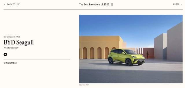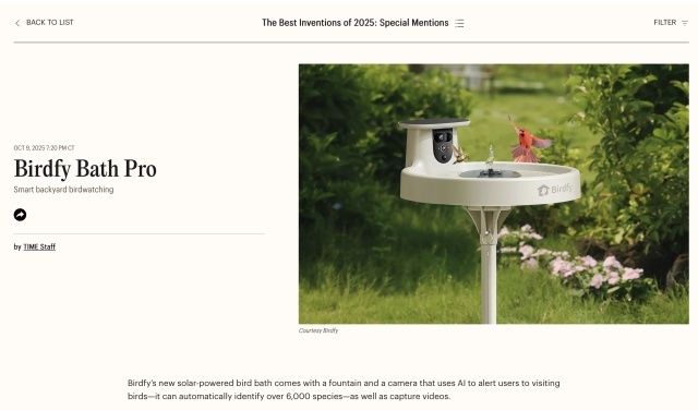 比亚迪海鸥成功入选交通运输领域最佳发明,《时代》周刊评语指出,“比亚迪在美国以外的许多地区已成为家喻户晓的电动车品牌”。此次传音入榜的Megabook S14,号称是市面上最轻的笔记本电脑,搭载了传音自主研发的AI模型,能执行多种AI辅助任务。荣耀两款入选产品均非其擅长的消费电子产品,而是硅碳负极电池、设备端 AI 深度伪造检测,体现了企业的硬核实力。另外,智能家居品牌深圳天和荣科技,入选产品Birdfy Bath Pro是一款配备摄像头的智能鸟浴盆,可让用户远程观看鸟儿跳水洗澡。深圳初创类公司奥赢科技开发的首款产品口袋微型相机Littpopo MicroCam X1也入选榜单。