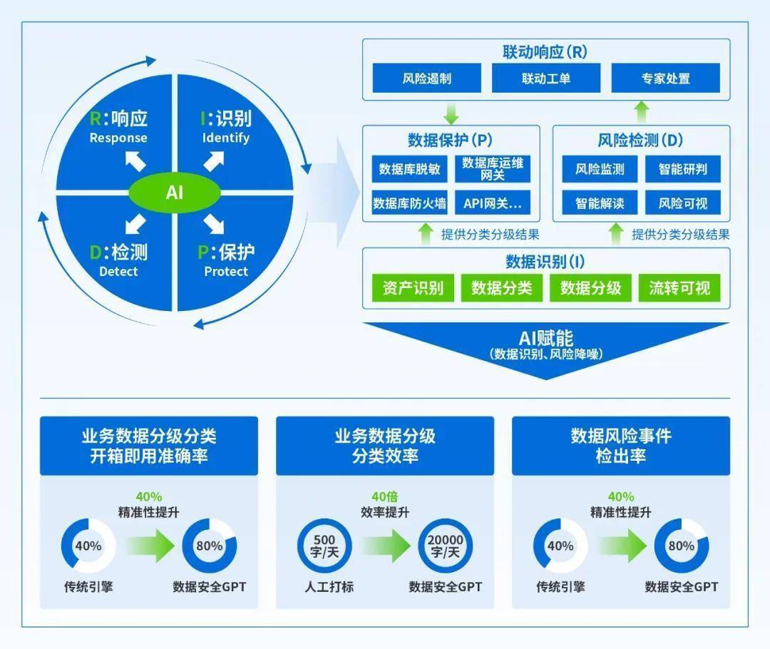基于安全GPT大模型技术构建,颠覆性提升动静态数据识别、分类分级以及用数风险检出率和准确率效果,帮助用户真实判断数据安全管控优先级、降低风险事件对数据的影响和损失,让运营体系实现真正闭环,切实保护用户数据资产。